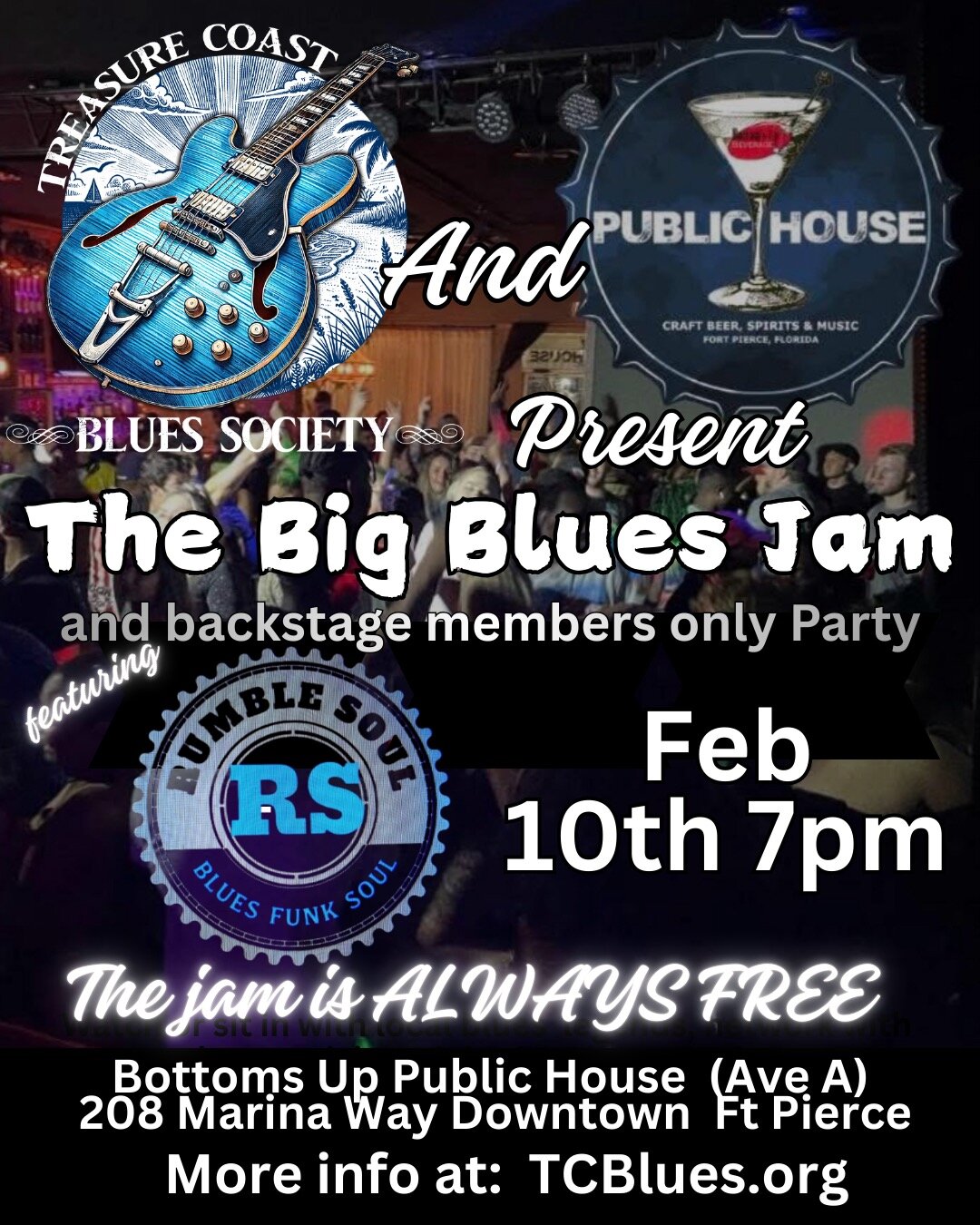 Active Members are welcome to come by at 6pm when we vote on the 2026 board of The Treasure Coast Blues Society.Stay-Tuned for details on TWO GREAT BLUES SHOWS coming in March!And as always, keep up-to-date on some great Blues Music happening in our area by going to our EVENTS page on our website.
