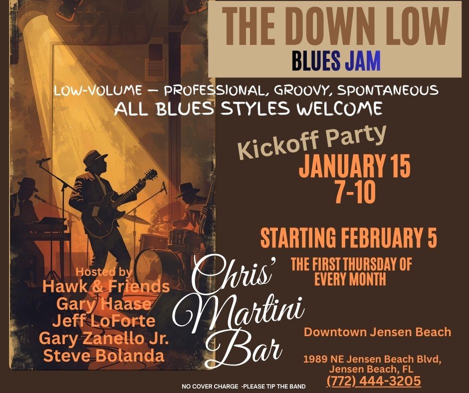 The Down Low Blues Jam is a low volume The old cool way to jam the blues. strictly low volume. Join world renowned musicians. This Jam is primarily blues, and all style of the blues is welcome. Hosted by Hawk Levy, Gary Haase, Jeff LoForte, Steve Bolanda, Gary Zanello Jr. this event is in conjunction with ‘Jamin in Jensen’ on Thursdays. The event will continue starting February 5 then on the first Thursday of every month. Set your calendars.