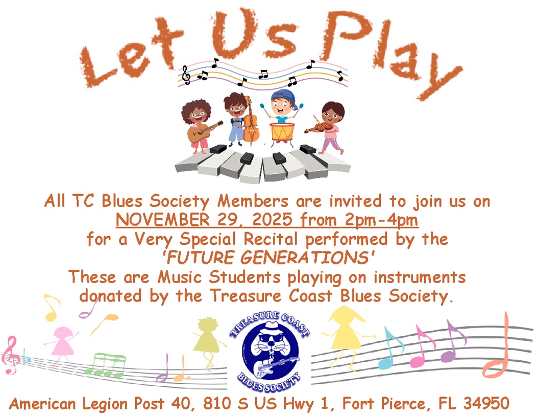 Let Us Play Recital + Add to Google Calendar + iCal / Outlook export Date Nov 29 2025 Time 2:00 pm - 4:00 pm Location American Legion Post 40 810 S US Hwy 1, Fort Pierce, FL 34950 Organizer Treasure Coast Blues Society Email TCBluesSociety@gmail.com Share this event