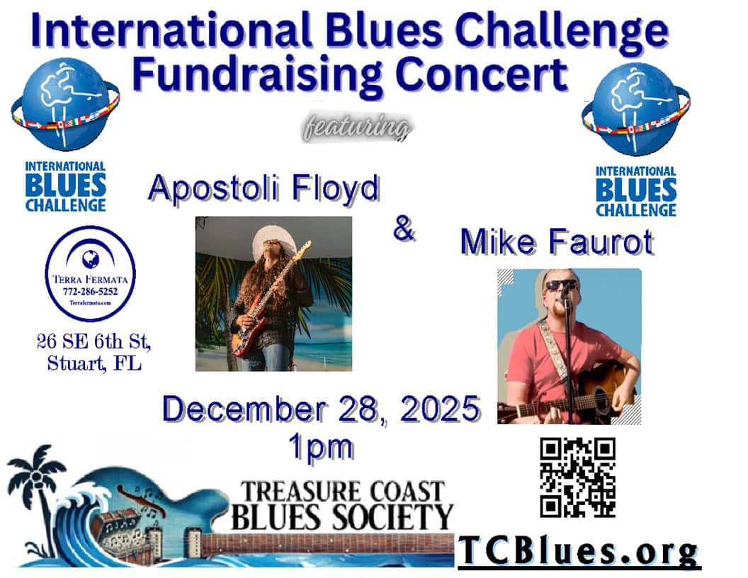 The Final IBC ‘Road To Memphis’ Concert + Add to Google Calendar + iCal / Outlook export Date Dec 28 2025 Time 1:00 pm - 6:00 pm Location Terra Fermata Tiki Bar 26 SE 6TH STREET, STUART, FL 34994 Website https://terrafermata.com/ Organizer Treasure Coast Blues Society Email TCBluesSociety@gmail.com Share this event